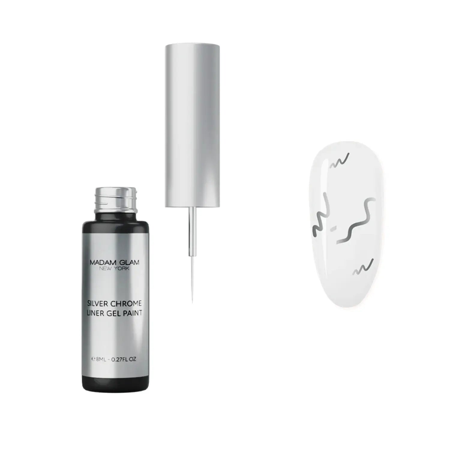 De Madam Glam Chrome Liner Gel Paint Silver is jouw go to voor strakke, opvallende nail art met een echte chrome finish. Deze zilveren art gel is highly pigmented en heeft een medium viscositeit, waardoor je super gecontroleerd kunt werken aan de kleinste details.