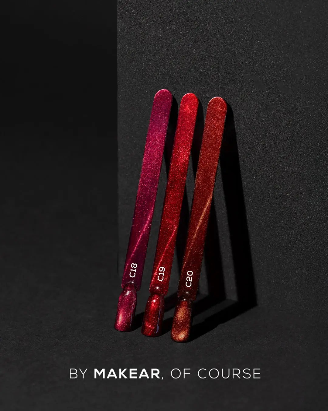 De Makear UV Gel Polish C19 is dé kleur voor wie houdt van die mysterieuze, elegante touch. Deze diepe rode tint met subtiele cat eye glans zorgt voor een fascinerend lichtspel dat verandert met elke beweging. Dankzij de magnetische deeltjes creëer je gemakkelijk een driedimensionaal effect dat zowel draagbaar als opvallend is.