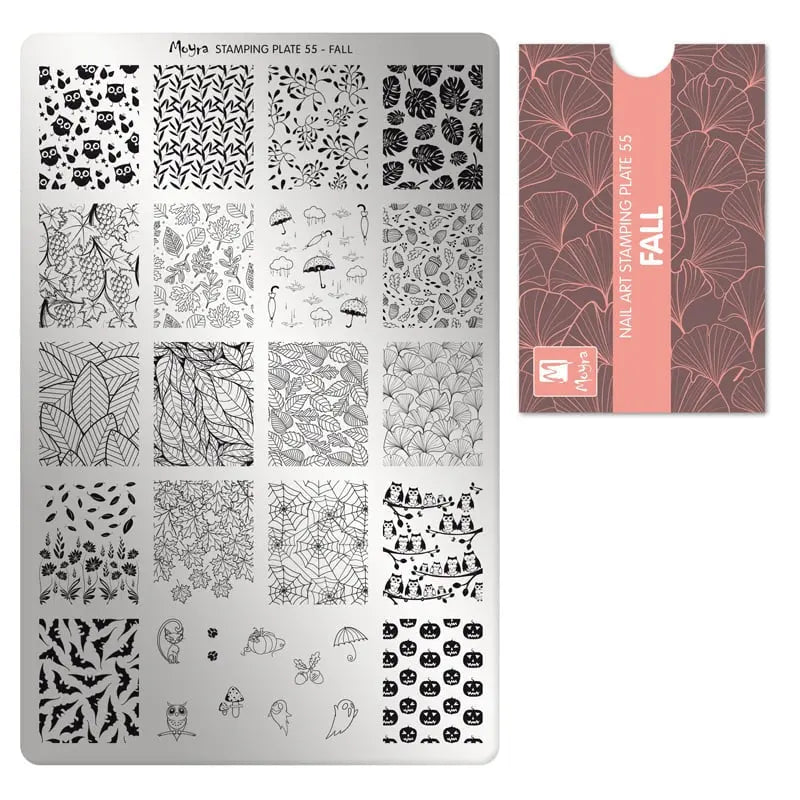 De Moyra Stamping No. 55 Fall is dé perfecte plaat voor cozy herfst vibes op je nagels. Denk aan blaadjes, takjes, herfstpatronen en stijlvolle details waarmee je moeiteloos een warme, seizoensgebonden look creëert. Deze grootformaat plaat is supergedetailleerd en werkt geweldig voor zowel beginners als pro’s.