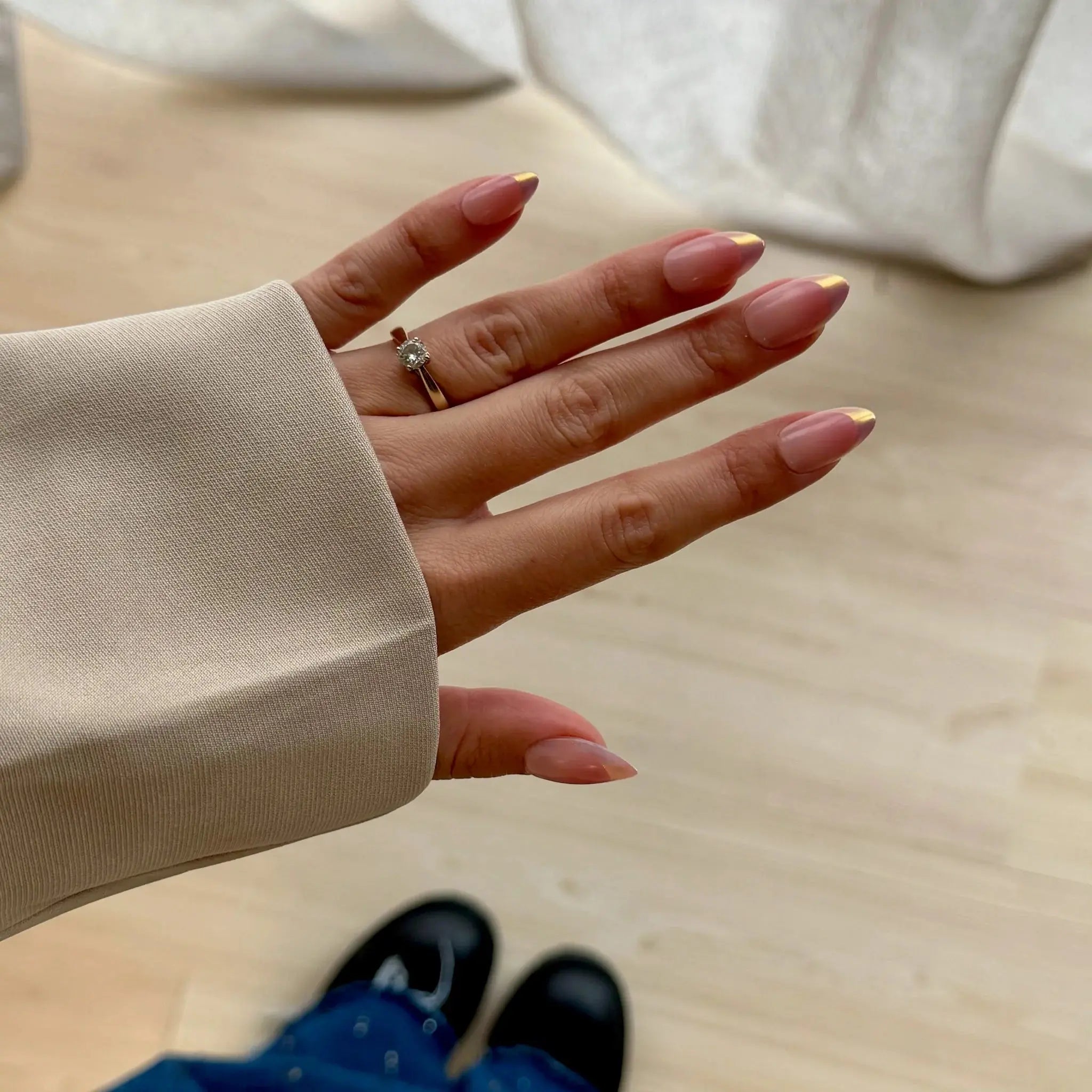 Dankzij het zachte gelmateriaal voelen de nagels comfortabel en natuurlijk aan, terwijl de medium almond vorm je handen direct een verfijnde, elegante uitstraling geeft. De parelmoer tips vangen het licht op een unieke manier, waardoor je mani bij elke beweging nét even anders schittert. Perfect voor bruiloften, datenights of gewoon als je jezelf wilt verwennen met iets moois.