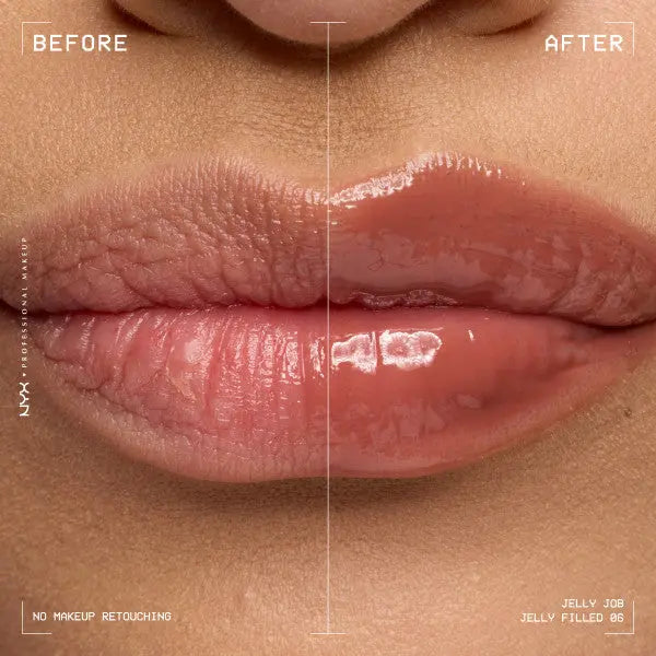 De NYX Professional Makeup Jelly Job Lipgloss Jelly Filled geeft je lippen een onweerstaanbare jelly-shine met een sappige, glazige finish die je look direct laat poppen. De innovatieve spatula-applicator glijdt soepel over de lippen en verdeelt de lichte, jelly-zachte formule gelijkmatig voor een juicy effect en optisch vollere lippen.