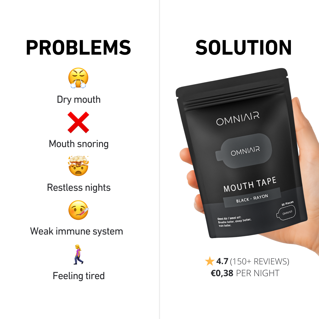 De Omniair Zwarte Mondtape met Pull-Off Tab is jouw geheime wapen voor een diepe, herstellende slaap. Deze slimme mondtape helpt je 's nachts weer door je neus te ademen, wat snurken, droge mond én vermoeid wakker worden helpt voorkomen. Het resultaat? Meer energie, heldere focus en een uitgeruste look in de ochtend.