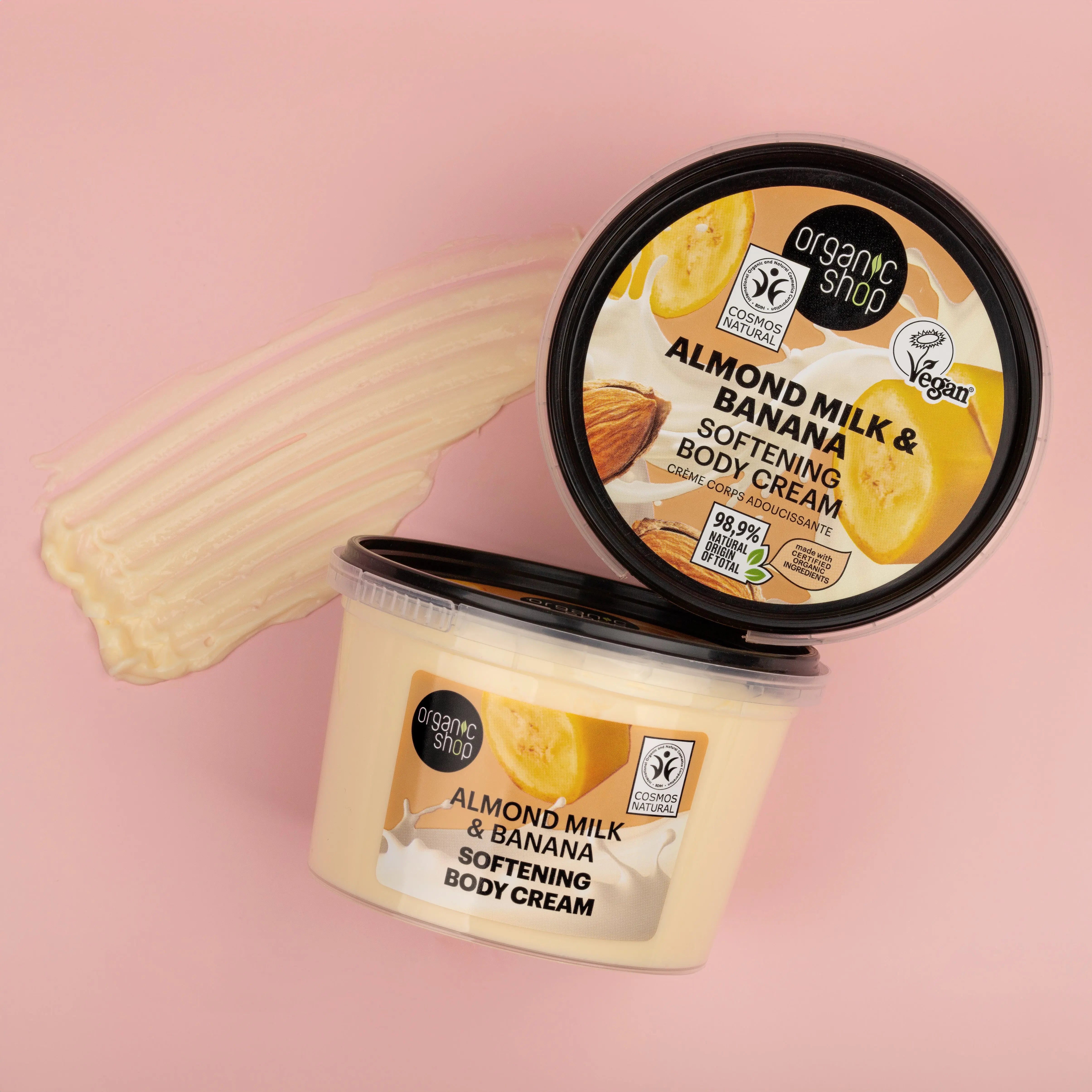 De Organic Shop Almond Milk & Banana Softening Body Cream is jouw nieuwe go-to voor zijdezachte, gevoede huid. Deze romige bodycrème combineert voedende amandelmelk met de natuurlijke zachtheid van banaan voor een ultiem verzorgend moment. De luchtige textuur trekt snel in, zonder vet aan te voelen, en laat je huid de hele dag soepel, gehydrateerd en licht geparfumeerd achter.