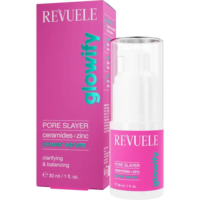 De Revuele Pore Slayer Power Serum Ceramides + Zinc is jouw redder in nood als je huid last heeft van glans, verstopte poriën of onzuiverheden. Dit krachtige serum met ceramiden en zink zuivert en balanceert de huid, terwijl het tegelijkertijd de huid barrière versterkt.