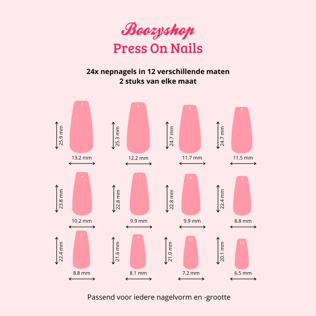 In deze set vind je 24 kunstnagels in 12 verschillende maten, zodat je voor elke nagel de perfecte fit hebt. Elke nagel is genummerd van 0 tot 11 – superhandig, want zo zie je in één oogopslag welke maat bij jouw nagels past. En natuurlijk krijg je er ook alles bij wat je nodig hebt: nagellijm en een prep pad om je nagels voor te bereiden op een flawless en long-lasting resultaat.
