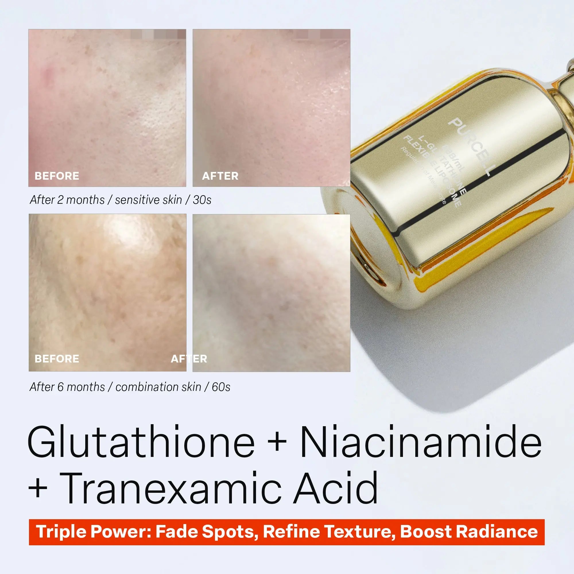Het Purcell 88b/ml L-Glutathione Flexible Liposome serum is jouw nieuwe skincare essential voor een heldere, egale en stralende huid. Deze all-in-one revitaliserende formule zit boordevol krachtige ingrediënten die samenwerken om je huid te verhelderen, te egaliseren én te verzorgen: zonder agressief aan te voelen.