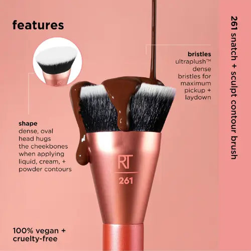 De Real Techniques Snatch + Sculpt Contour Brush is een ovale kwast met dichte haren die perfect is voor het contouren van de jukbeenderen! De 261 make-upkwast heeft een ovale vorm die moeiteloos de gezichtscontouren definieert en lift.