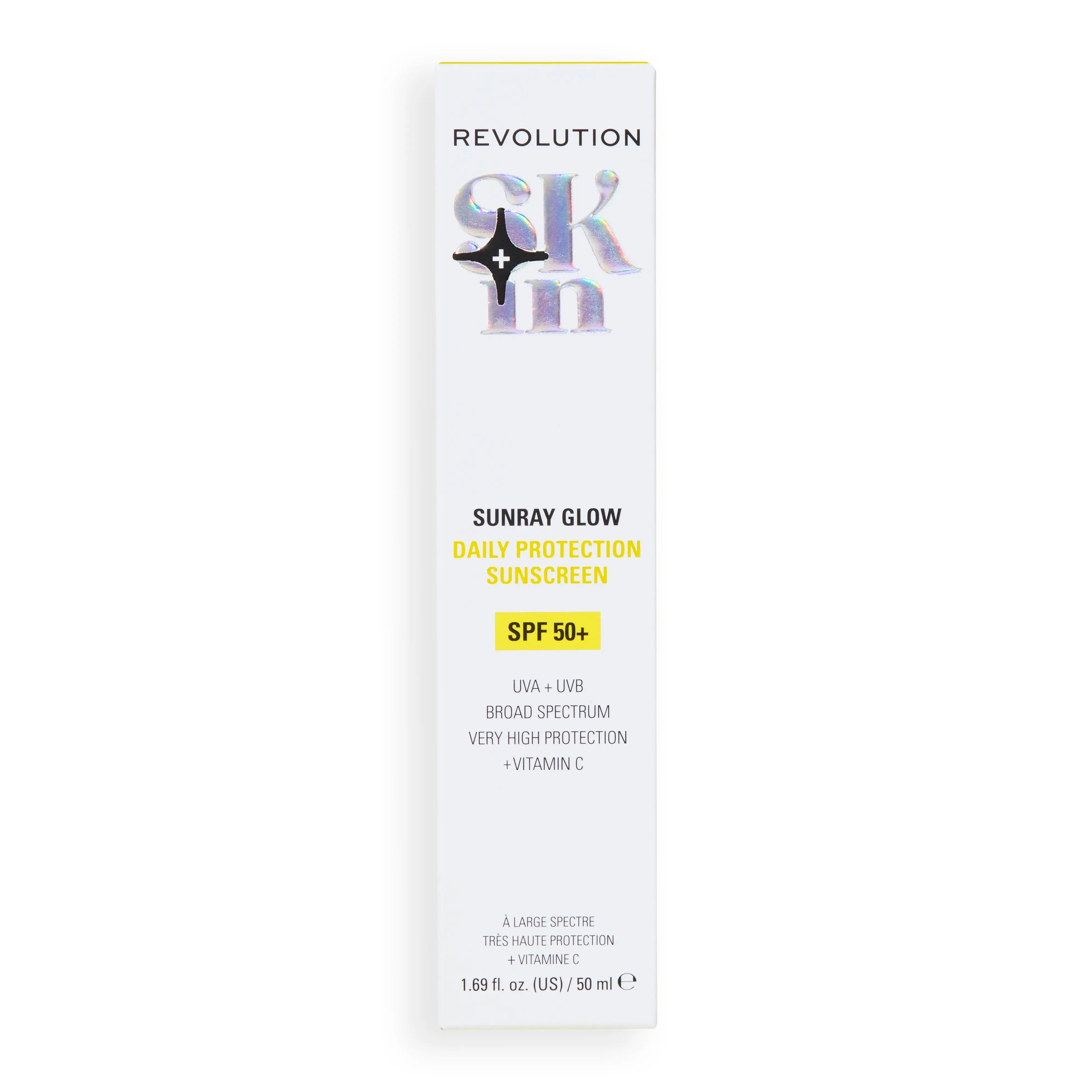 De Revolution Skin Sunray Glow Daily Protection Sunscreen SPF 50+ with Vitamin C is jouw all-in-one zomervriend voor een stralende, zon beschermde huid! Deze multitasker werkt als zonbescherming, primer én moisturizer in één. De superlichte formule met subtiele shimmer boost je glow en laat je huid direct frisser en helderder ogen – zonder een vettig laagje achter te laten.