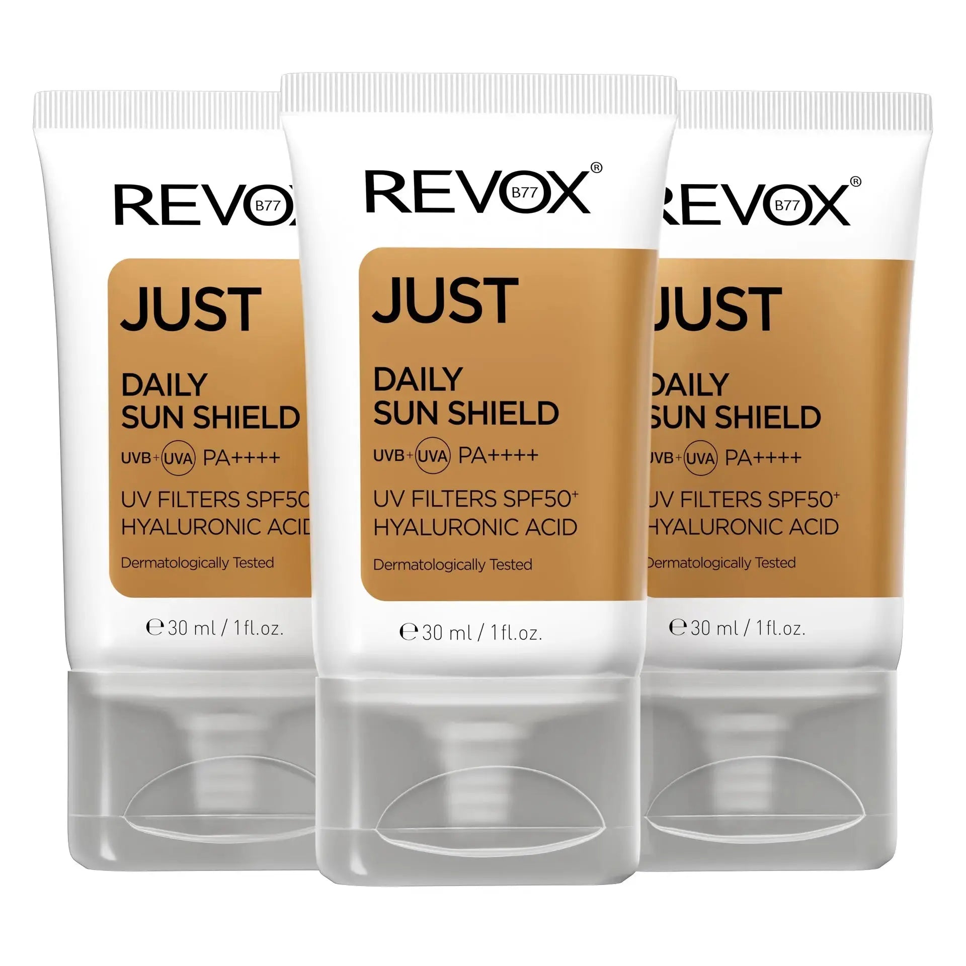 De Revox Just Daily Sun Shield SPF 50+ with Hyaluronic Acid Set is jouw ultieme dagelijkse zonbescherming voor gezicht en hals. In deze set vind je maar liefst drie stuks van deze krachtige zonnecrème, zodat je altijd voorbereid bent op een zonnige dag!