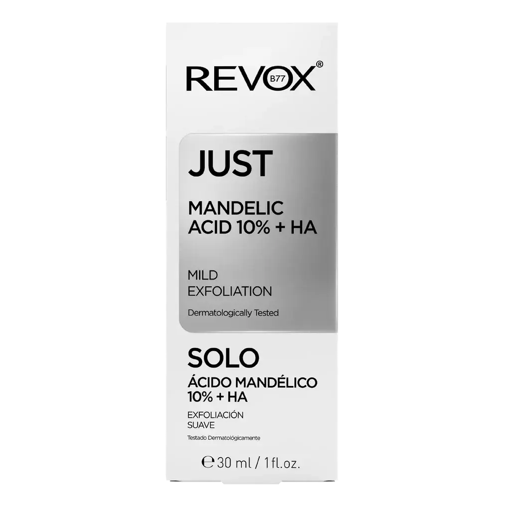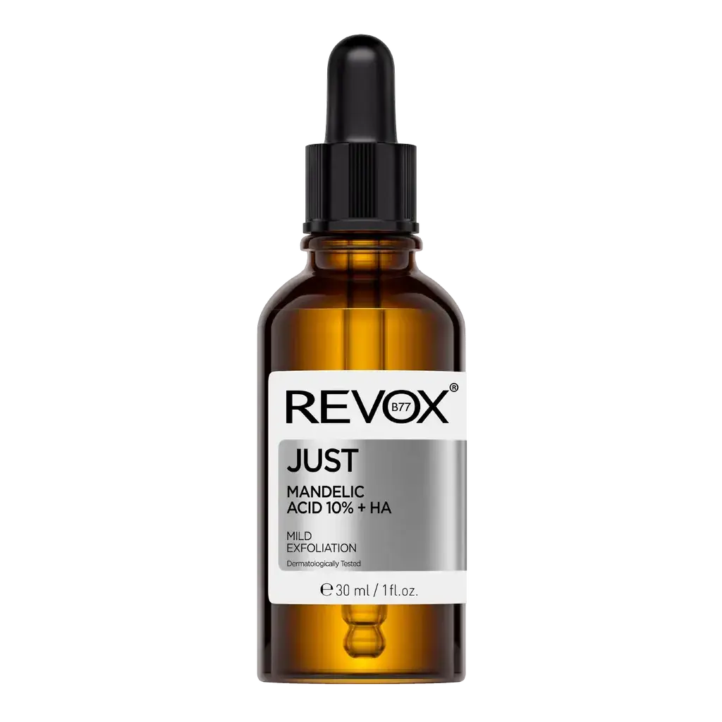 De Revox Just Mandelic Acid 10% + Ha Mild Exfoliation is een mild exfoliërend serum voor gezicht en hals dat je huidtextuur verfijnt en verheldert. Mandelic acid, afkomstig van bittere amandelen, is een zachte AHA en daardoor perfect voor gevoelige en acne-gevoelige huidtypen. Het serum verwijdert dode huidcellen, verkleint poriën, en zorgt ervoor dat je huid fris en glad aanvoelt.