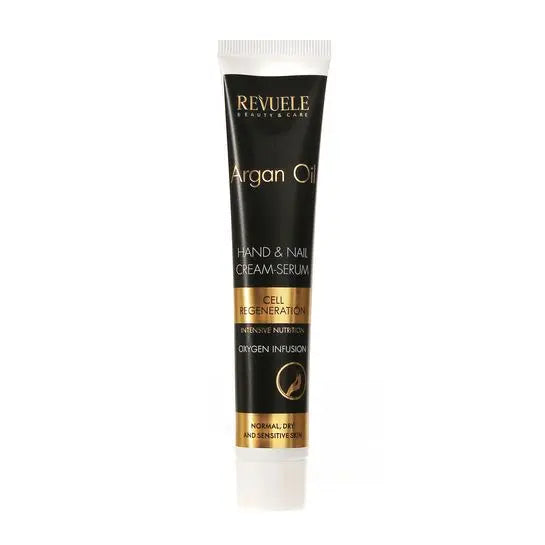 De Revuele Argan Oil Hand & Nail Cream-Serum is een handcrème met een krachtige anti-aging formule. De formule dringt diep door in de huid en voedt de huid intensief. De Argan Olie in deze handcrème heeft een positief effect op het herstel van de nagelstructuur en nagelriemen en stimuleert het huidvernieuwingsproces.