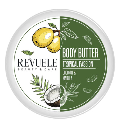 De REVUELE Body Butter Tropical Passion Coco & Marula is een rijke, luxueuze body butter die je huid intens voedt en hydrateert.