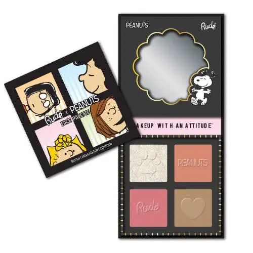 Het Rude Cosmetics x Peanuts Face Palette is een alles-in-één palette en bevat twee blushes, een highlighter en een contour voor een prachtige look!