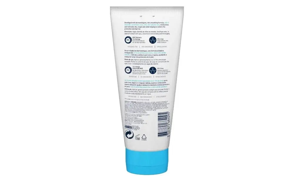 De CeraVe SA Smoothing Cream Anti-ruwe Huidcrème is dé oplossing voor een droge, ruwe en oneffen huid. Deze voedende, maar niet-vette crème is ontwikkeld samen met dermatologen en combineert krachtige ingrediënten die de huid intens verzorgen én gladder maken. Dankzij hyaluronic acid wordt de huid intens gehydrateerd, terwijl salicylic acid en ureum zacht exfoliëren en ruwe plekjes zichtbaar verzachten.