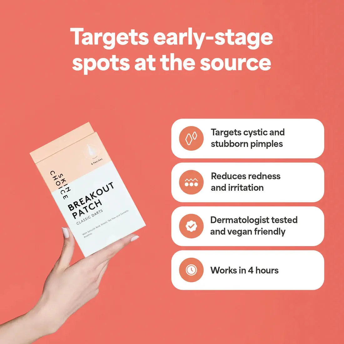 De Skin Choice Breakout Patch Classic Darts is jouw geheime wapen tegen puistjes in een vroeg stadium. Dankzij innovatieve microdart-technologie dringt deze patch direct door in de huid om onzuiverheden aan te pakken voordat ze volledig doorbreken. Elke patch bevat een krachtige mix van ingrediënten die puistjes bij de bron behandelen en tegelijkertijd de huid kalmeren en hydrateren.