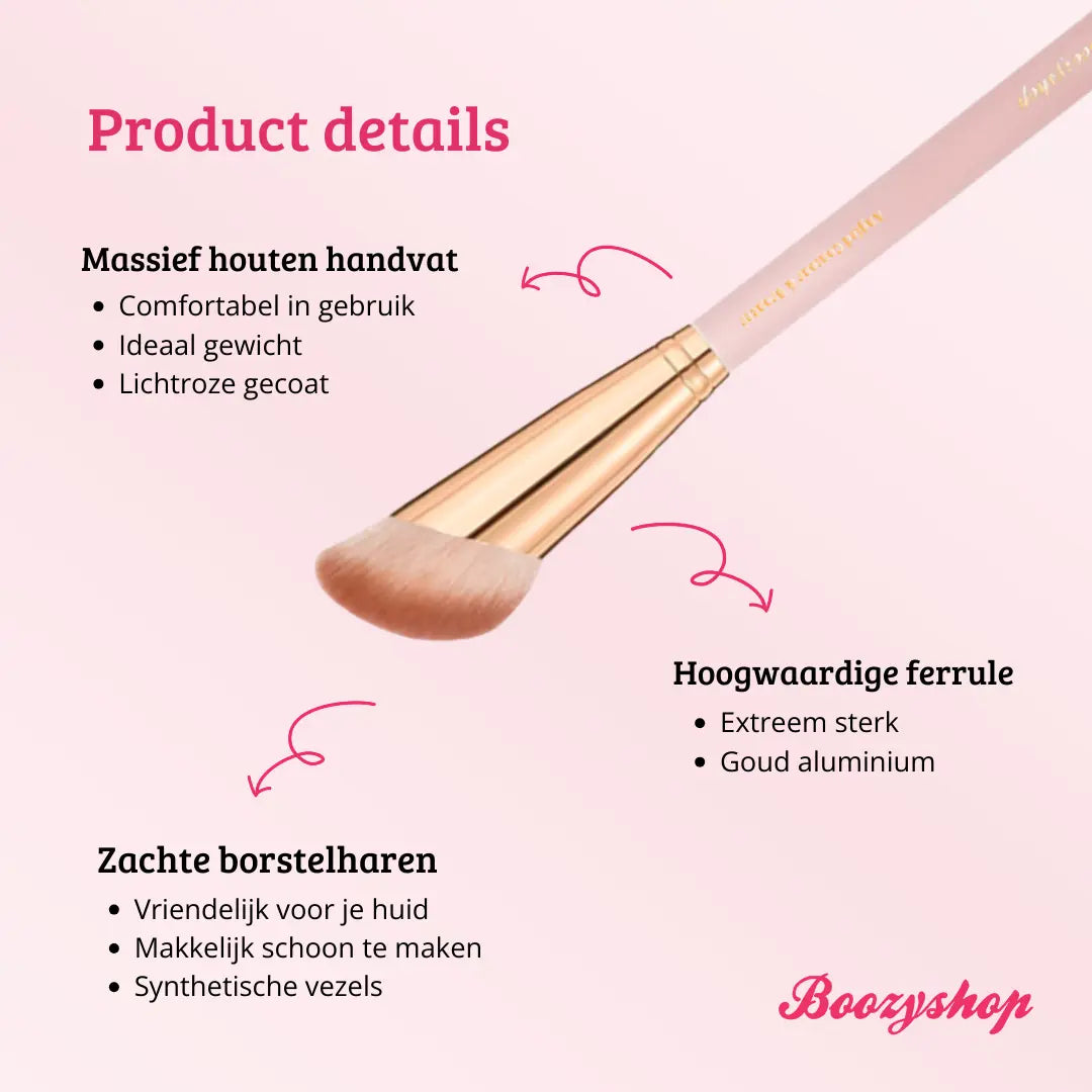 De Boozyshop Soft Pink & Gold Angled Contour & Bronzer Brush is dé ultieme make-up kwast voor het gelijkmatig aanbrengen en blenden van jouw contour en bronzer. Poederproducten breng jij moeiteloos aan met deze kwast. De schuin afgesneden haren volgen gemakkelijk de contouren van je gezicht, waardoor jij die mooie chiseled look kunt creëren.