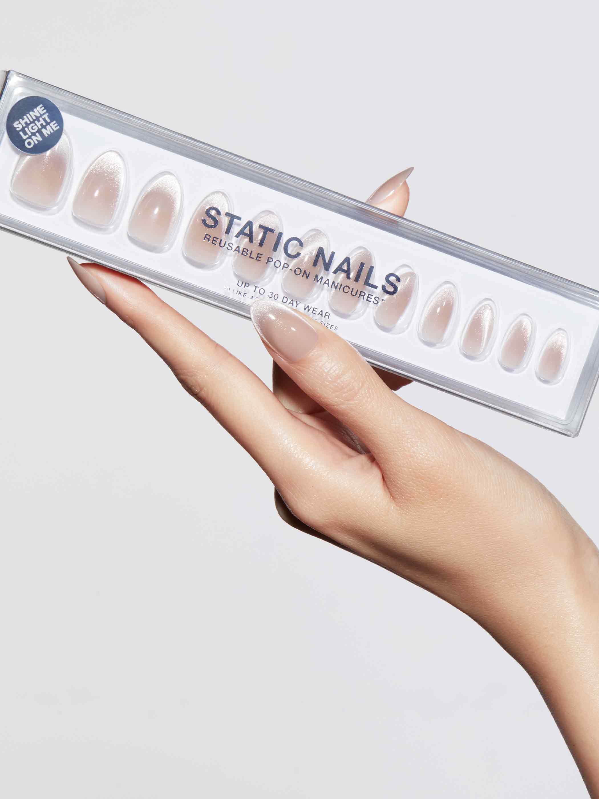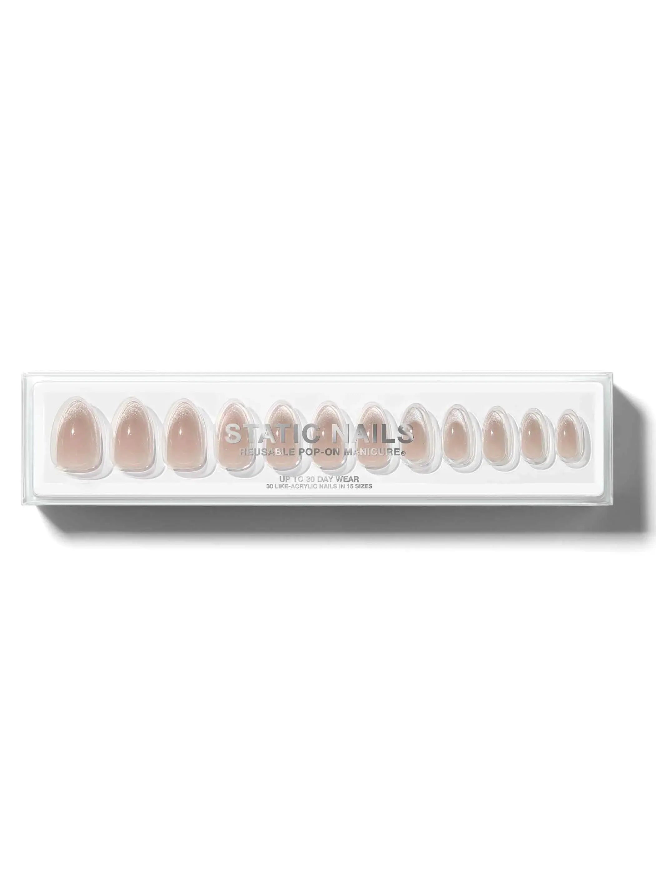 De Static Nails Reusable Pop-On Manicure Champagne Room combineert elegantie met innovatie voor een next-level manicure die jij gewoon zelf thuis aanbrengt. Deze like-acrylic pop-on nagels hebben een klassieke ovale vorm en een chique cat eye french look: super stijlvol en draagbaar voor elke gelegenheid.
