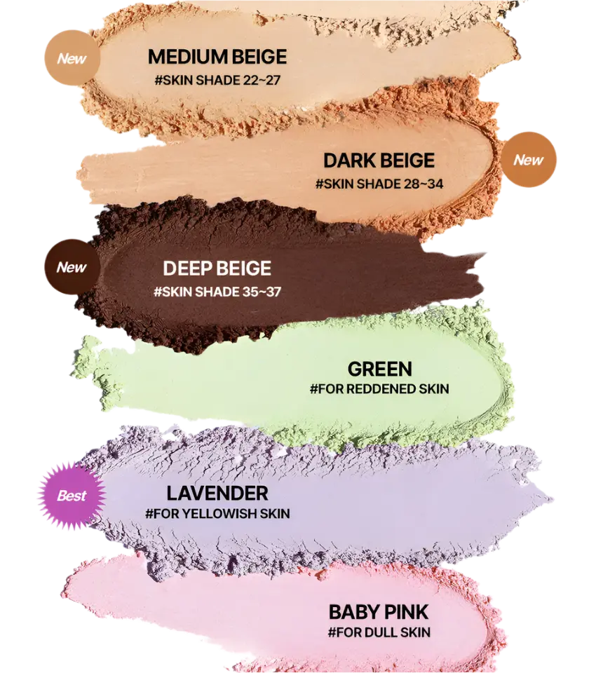 Of je nu kiest voor de transparante versie met een subtiele tone-up, of een van de kleurcorrigerende varianten zoals groen (tegen roodheid) of lavendel (tegen een vale teint), je huid krijgt altijd een frisse, egale glow. Perfect voor touch-ups onderweg of als laatste stap in je routine!