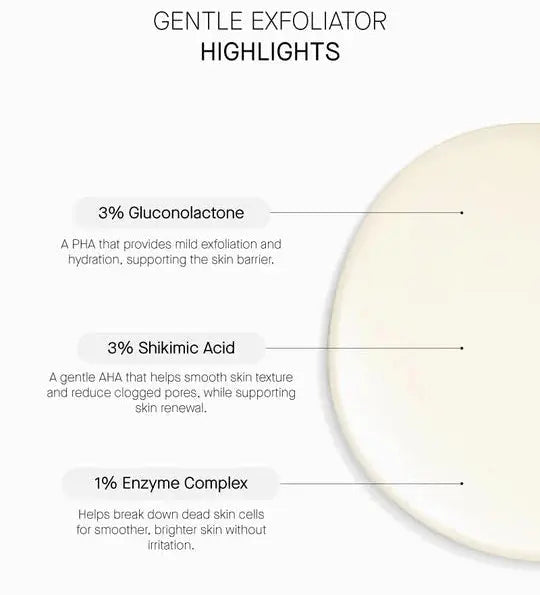 Met 3% gluconolactone (PHA) en 3% shikimic acid, zorgt deze formule voor een zachte exfoliatie terwijl het je huid hydrateert, de barrière versterkt en vroegtijdige huidveroudering helpt voorkomen. Het 1% enzymcomplex verwijdert op milde wijze dode huidcellen, zonder te scrubben of de huid te beschadigen. Ideaal voor alle huidtypes, zelfs de gevoelige! Je huid voelt na gebruik meteen gladder, frisser en beter voorbereid op je volgende skincare-stappen