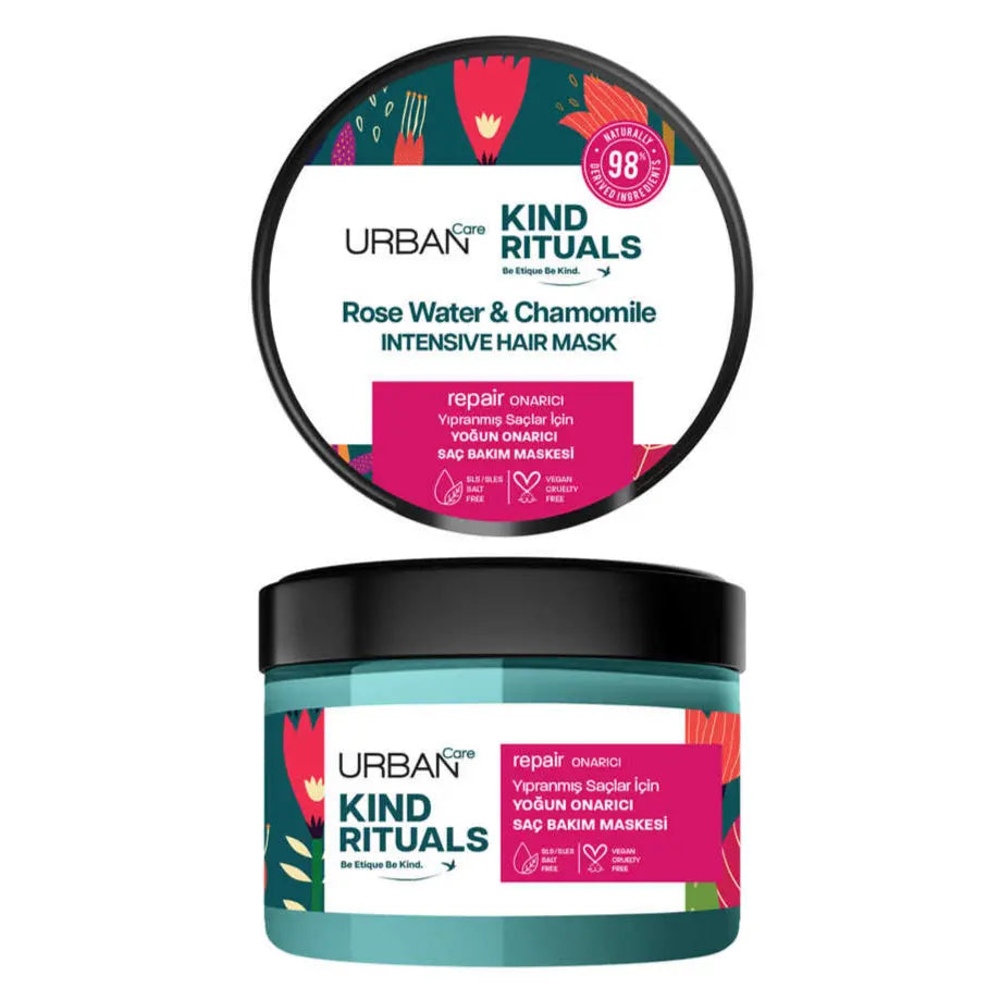 De Urban Care Kind Rituals Rose Water Chamomile Hair Mask is een intens herstellend haarmasker dat je beschadigde lokken weer tot leven brengt. Verrijkt met voedend rozenwater, kalmerende kamille en plantaardige keratine, helpt dit masker je haar te voeden, herstellen en opnieuw op te bouwen, precies wat breekbaar en dof haar nodig heeft.