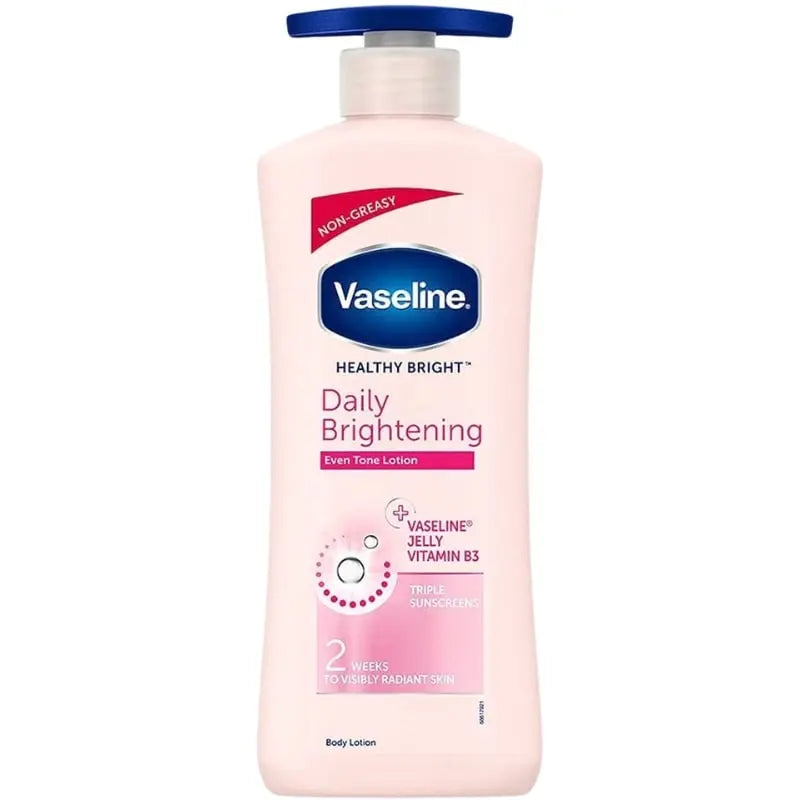 De Vaseline Body Lotion Daily Brightening 600 ml. is een verzorgende bodylotion die de huid helpt haar natuurlijke glans terug te krijgen. De lichte, snel intrekkende formule hydrateert intens en zorgt binnen twee weken voor een zichtbaar stralendere, gezondere huid. Met microdruppels van Vaseline® Jelly helpt deze lotion om de huid te herstellen door langdurige hydratatie te bieden, waardoor droge plekken verdwijnen en de huid zacht en soepel aanvoelt.