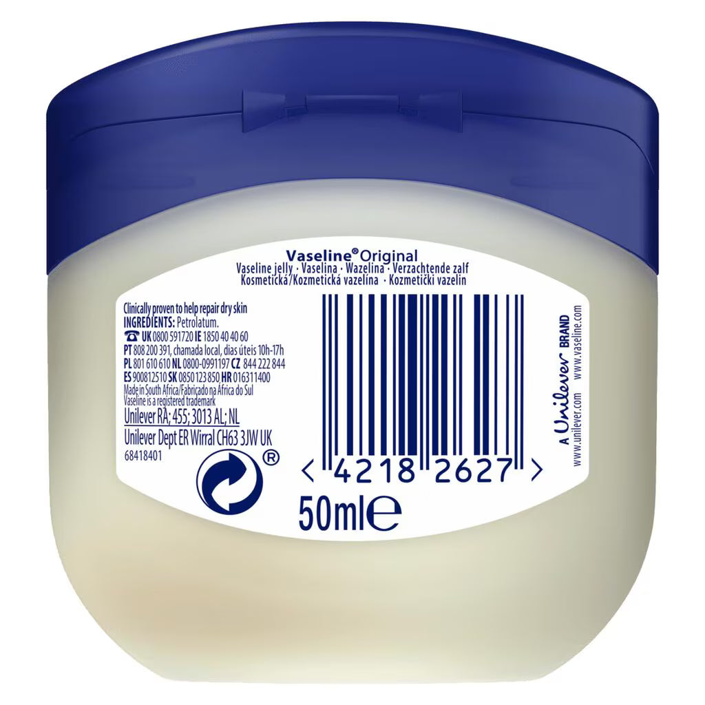 De Vaseline Pure Petroleum Jelly Original 50 ml is een echte klassieker in huidverzorging: en dat al meer dan 150 jaar! Deze rijke, voedende jelly is dé oplossing voor droge, ruwe of geïrriteerde huid en werkt als een beschermend laagje dat vocht vasthoudt en je huid helpt zichzelf te herstellen.